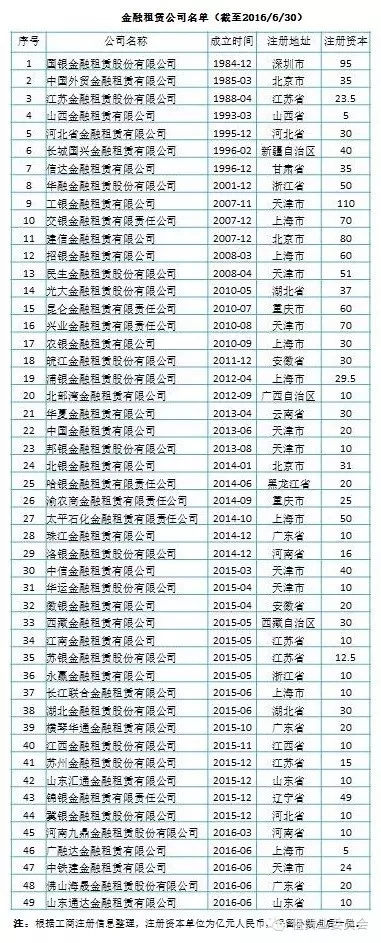 截至2016年上半年,全國已成立金融租賃公司49家,注冊資本合計1518.5億元,實收資本約為1425億元。