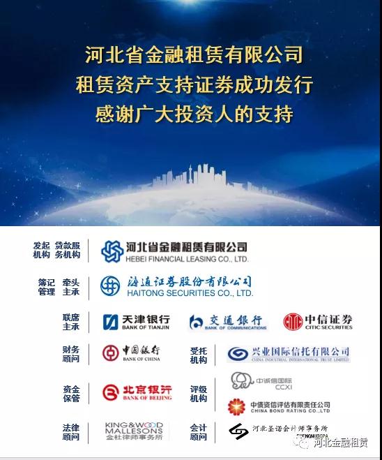 日前,河北省金融租賃有限公司(以下簡稱“河北金租”)冀租穩(wěn)健2020年第一期租賃資產(chǎn)支持證券在銀行間債券市場成功簿記建檔發(fā)行,獲得了交通銀行、中國銀行等大型國有銀行及其他各類銀行的踴躍認購,合計金額15.65億元。