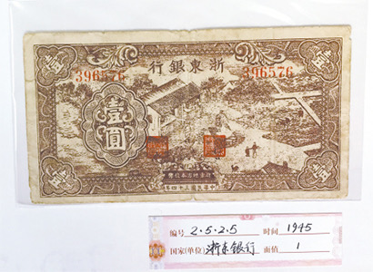 1945年4月1日,浙東銀行在浙江余姚成立,發行了18種36式浙東銀行幣。浙東銀行紙幣每元折合大米一市斤,不會貶值,在浙東人民群眾中享有很高的信譽。