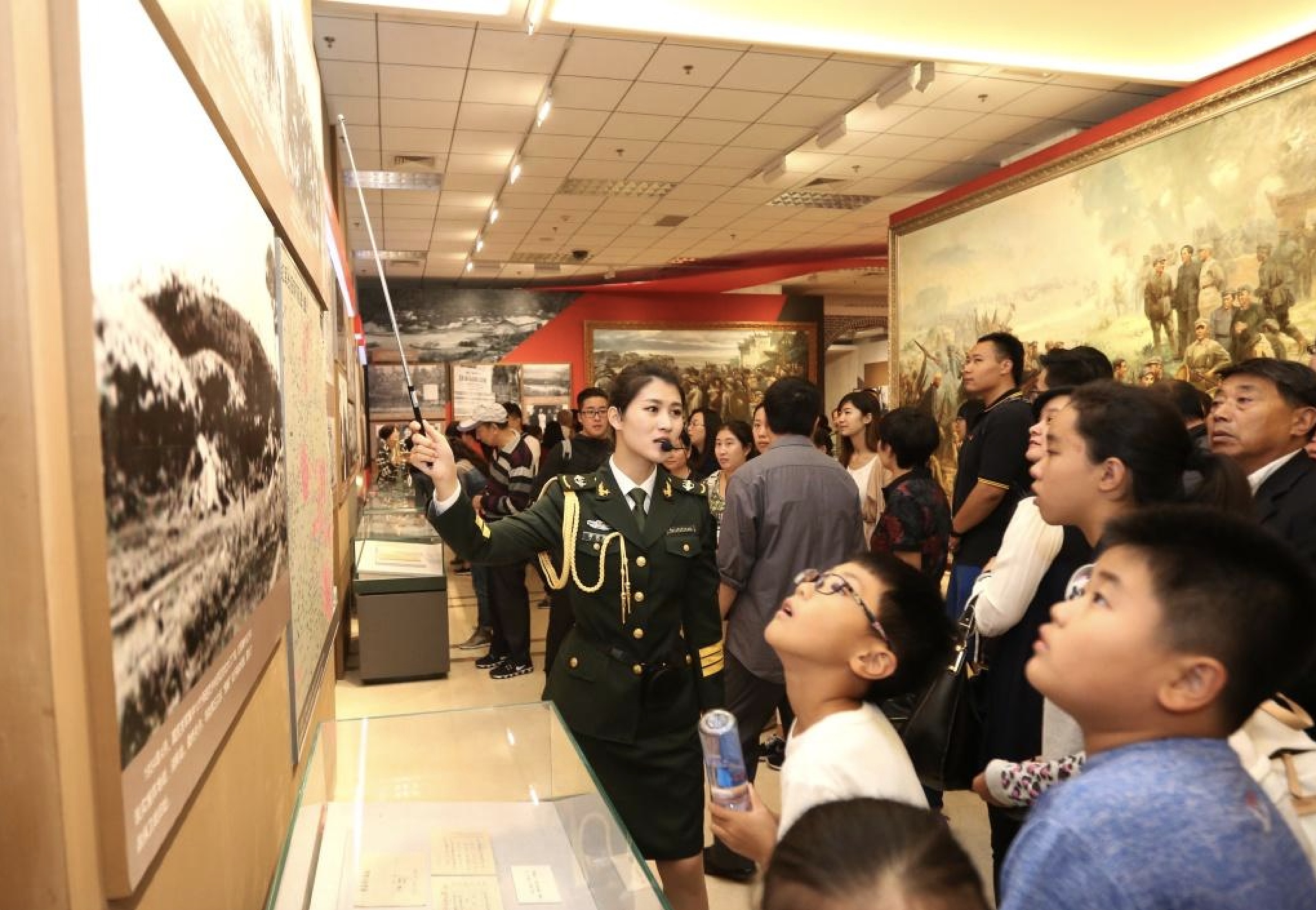 北京中國人民革命軍事博物館開放“英雄史詩 不朽豐碑——紀(jì)念中國工農(nóng)紅軍長征勝利80周年主題展覽”,解說員在為參觀者講解。