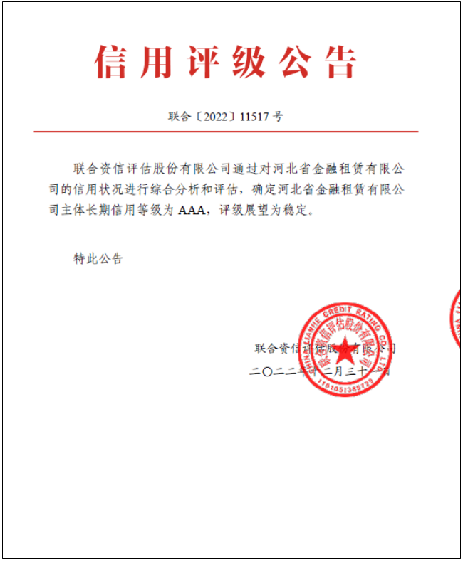 關(guān)注 | 河北金租斬獲“雙AAA”長期主體信用評(píng)級(jí)